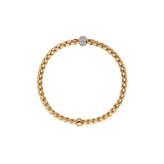 misura M (cm 17) - Bracciale Fope Flex’it collezione Eka, in Oro giallo e oro bianco 18 carati. Elemento centrale formato da un anello in oro bianco impreziosito da un pavé di diamanti bianchi per un totale di 0,19 carati. Lo spessore del bracciale è di 3,60 mm. Le maglie piatte dell'anello sono state sottoposte ad uno stress test di 12.000 trazioni per garantirne la qualità. Le maglie sono elastiche grazie alla tecnologia Flex’it brevettata Fope, con piccole molle in oro nascoste lungo la maglia. Questo permette una vestibilità comoda e adattabile senza necessità di chiusure.
