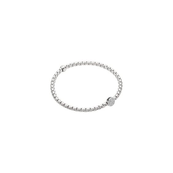 misura M (cm 17) - Bracciale Fope Flex’it collezione Eka, in Oro Bianco 18 carati. Elemento centrale formato da un pavé di diamanti bianchi per un totale di 0,22 carati. Il bracciale è spesso 3,50 mm. È presente una barra fissa in oro bianco con inciso il marchio Fope. Le maglie piatte dell'anello sono state sottoposte ad uno stress test di 12.000 trazioni per garantirne la qualità. Le maglie sono elastiche grazie alla tecnologia Flex’it brevettata Fope, con piccole molle in oro nascoste lungo la maglia. Questo permette una vestibilità comoda e adattabile senza necessità di chiusure.