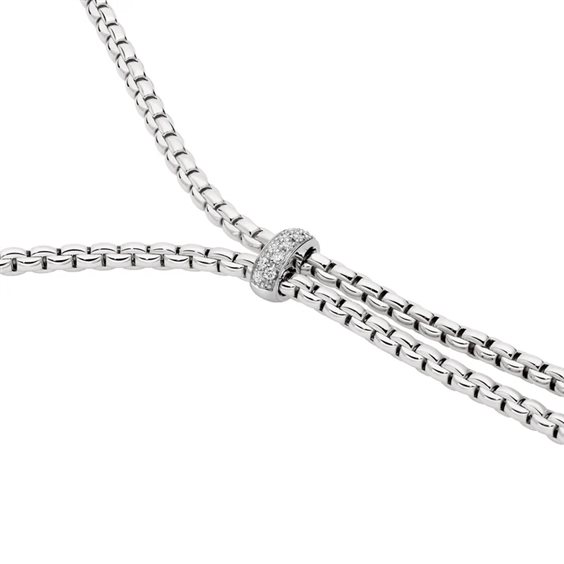 Collana Lariat Fope collezione Eka, in Oro Bianco 18 carati, impreziosita da un anello con pavé di diamanti bianchi per un totale di 0,10 carati.