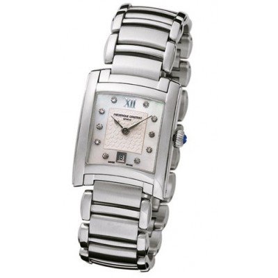 Orologio da donna Delight Carree in acciaio con doppio cinturino ( uno acciaio con chiusura a scomparsa e l'altro in seta ). Movimento al quarzo, vetro zaffiro, resistente all'acqua ( 3 ATM ), corona '2-0-Rings' con cabochon blu, quadrante in madreperla con diamanti (0,08ct). Le dimensioni della cassa sono 35x28 mm, spessore 9.0mm.
