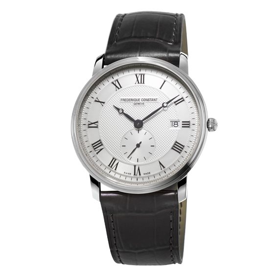 Orologio elegante e ultrapiatto interamente realizzato in Svizzera. Cassa in acciaio inox, vetro zaffiro antigraffio piatto. Numeri romani e lancette nere. Piccoli secondi a ore 6 e data a ore 3.