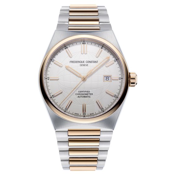 MOVEMENT: FC-303 CALIBER, AUTOMATIC, CERTIFIED BY THE COSC 26 JEWELS, 38-HOUR POWER RESERVE, 28'800 ALT/H CASE: POLISHED STAINLESS STEEL & ROSE GOLD-PLATED 3-PARTS CASE DIAMETER OF 41MM CONVEX SAPPHIRE CRYSTAL WITH ANTI-GLARE COATING ON BOTH SIDES. SEE-THROUGH CASE BACK WATER-RESISTANT UP TO 5 ATM DIAL: SILVER COLOR DIAL, GLOBE DECORATION AND ROSE GOLD-PLATED APPLIED INDEXES WITH WHITE LUMINOUS TREATMENT DATE WINDOW AT 3 O’CLOCK HAND-POLISHED ROSE GOLD-PLATED HANDS WITH WHITE LUMINOUS TREATMENT STRAP: STAINLESS STEEL AND ROSE GOLD-PLATED BRACELET WITH AN EASY STRAP CHANGING SYSTEM. THE WATCH COMES WITH ITS OWN EXTRA RUBBER STRAP