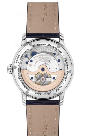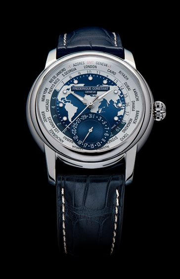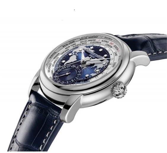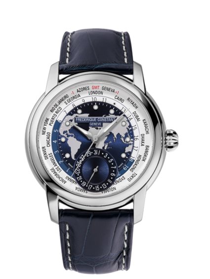 Frederique Constant FC-718NWWM4H6 ore del mondo classico in edizione limitata 1888 pezzi al mondo orologio automatico con calibro di manifattura FC-718 con finiture perlage e decorazioni cote de Geneve circolar, cassa in acciaio lucida diametro 42 mm. spessore 12 mm. vetro zaffiro bombato, quadrante blu e grigio con decorazione globo argento, disco con indicazione di 24 città di colore bianco a contrasto. Cinturino in pelle di coccodrillo blu navy con cuciture bianche slavate a contrasto.