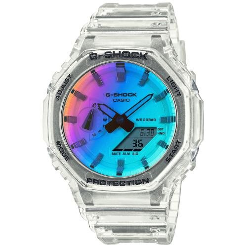 Orologio Analogico e Digitale Multifunzione Linea G-SHOCK con doppia illuminazione: una volta azionata la funzione si accendono sia la parte digitale che quella analogica. Antiurto: La costruzione anti urto protegge da colpi e vibrazioni. Neobrite: Indici e lancette hanno un rivestimento fluorescente e si illuminano al buio dopo lo spegnimento di una fonte luminosa Funzione ora mondiale: mostra l'ora di fino a 29 fusi orari. Cronometro: - 1/100 sec. Timer: - 1/1 sec. - 24 ore 5 allarmi giornalieri indipendenti per ricordare in modo personalizzato appuntamenti importanti. Funzione di spostamento delle lancette: Con la pressione di un tasto, le lancette si spostano permettendo la totale visibilità delle funzioni digitali. Attivazione/disattivazione del suono dei tasti. Calendario automatico. Formato 12/24 ore. Cassa in carbonio nero copricassa in resina trasparente. Cinturino in resina trasparente. Quadrante multicolor. Vetro minerale. Impermeabile 20 bar (atm). 3 anni circa la durata della batteria. Scatola libretto Istruzioni e Garanzia Originali.