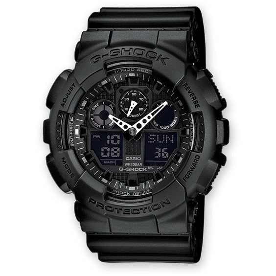 Questo orologio di Casio della collezione G-Shock ha referenza GA-100-1A1ER ed è perfetto per gli animi più sportivi. Questo modello di orologio, infatti, si caratterizza per avere funzioni all’avanguardia e decisamente performanti. La funzione Auto-lumière LED è ideale per illuminare il display dell’orologio, per fare questo è sufficiente ruotare leggermente il polso. L’orologio Casio, inoltre, è anche antiurto: in questo modo sarà protetto da colpi e vibrazioni. Ma non solo, si tratta anche di un modello antimagnetico proprio grazie alla costruzione della sua cassa che, grazie alla sua struttura, è studiata appositamente per essere protetta dai campi magnetici. La funzione ora mondiale, invece, mostra l’ora fino a 29 fusi orari e il cronometro permette di rilevare il tempo trascorso, il tempo parziale e il tempo finale con una precisione di 1/100 di secondo fino ad un massimo di 100 ore. Gli amanti della precisione posso scegliere questo orologio Casio G-Shock per la sua funzione di Timer conto alla rovescia, che permette di ricordare eventi particolari o che si ripetono, emettendo un segnale acustico al momento impostato, quindi riprendendo a contare automaticamente dal momento impostato. Il tempo può essere impostato in minuti con un anticipo di fino a 24 ore, e questa funzione risulta particolarmente utile anche nel caso in cui si debbano assumere medicinali o per interval training. Con questo cronografo da uomo di Casio, inoltre, è possibile impostare fino a 5 allarmi giornalieri e indipendenti: al momento indicato verrà emesso un segnale acustico che funzionerà da promemoria per la persona che porta al polso questo segnatempo. Inoltre, un allarme disattivabile scandisce il passare di ogni ora. Attraverso la funzione snooze, in particolare, ogni volta che si ferma l’allarme, questo ricomincia a suonare dopo pochi minuti. È possibile impostare anche il calendario automatico che, una volta inserito, visualizza sempre la data esatta. L’ora può essere visualizzata, a seconda delle preferenze, a 12 oppure a 24 ore. L’accuratezza è di +/- 15 secondi al mese. Il Casio G-Shock GA-100-1A1ER è realizzato con vetro minerale che, essendo robusto e antigraffio, protegge l’orologio da danni antiestetici. La cassa e il cinturino, invece, sono in resina: si tratta, in particolare, di un materiale di tipo sintetico e che, essendo estremamente resistente e flessibile, è ideale per orologi come questo da utilizzare nelle condizioni più estreme. Questo cronografo è alimentato con una batteria CR1220 della durata di circa 2 anni. La classificazione di impermeabilità di questo modello è di 20 bar, ovvero 200 metri di profondità, e, di conseguenza, risulta essere un accessorio perfetto da portare al polso anche per immersioni in apnea senza attrezzatura. Attenzione, però, tenete presente che l’indicazione dei metri si riferisce non ad una profondità di immersione ma alla pressione atmosferica che è stata utilizzata nell’ambito dell’omologazione di impermeabilità. La cassa dell’orologio cronografo Casio con codice GA-100-1A1ER ha altezza di 55mm, larghezza di 51,20 mm e profondità di 16,90 mm, e complessivamente pesa 70g.