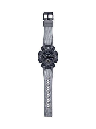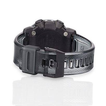 Orologio G-SHOCK. Cassa in resina color grigio trasparente G-SHOCK (antiurto che protegge da urti e vibrazioni) antimagnetica, fondo in metallo. Quadrante nero con luce led per illuminare l'orologio. Funzioni: tempo (visualizzazione orario dual time con formato 12 o 24 ore), calendario automatico, fuso orario, cronometro, timer, allarmi giornalieri. Funzione di spostamento delle lancette: premendo un tasto, le lancette si spostano permettendo la totale visibilità delle altre funzioni. Impermeabile 20 bar (200 metri).