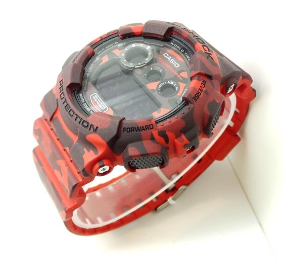 Orologio Digitale.Cassa in resina G-SHOCK(antiurto che protegge da urti e vibrazioni);con stampa militare rossa;diametro 51mm.-spessore 15,5mm;fondo in metallo .Funzioni:Ora-data-12 o 24 ore- World Time- Cronometro- 5 allarmi giornalieri-Timer.Batteria durata 7 anni.Vetro minerale.Quadrante in negativo-illuminazione con doppio led. Cinturino in resina con stampa militare rossa;29-22mm;fibbia con doppio ardiglione.Impermrabile 20 bar (200 metri). Peso 72 grammi.Garanzia 2 anni.