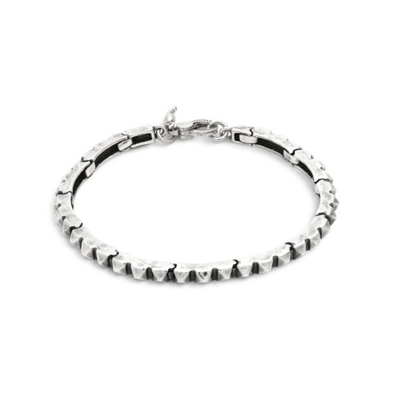 Un bracciale forte e luminoso, in argento brunito, realizzato da una sequenza di segmenti sormontati da piccole borchie. Un gioiello contemporaneo all'insegna della continuità visiva, fatto completamente in azienda con maestria artigianale. Dettagli Argento 925 Lunghezza 19 cm (M), 21 cm (L) Chiusura con moschettone Fatto a mano in Italia SKU: 12392