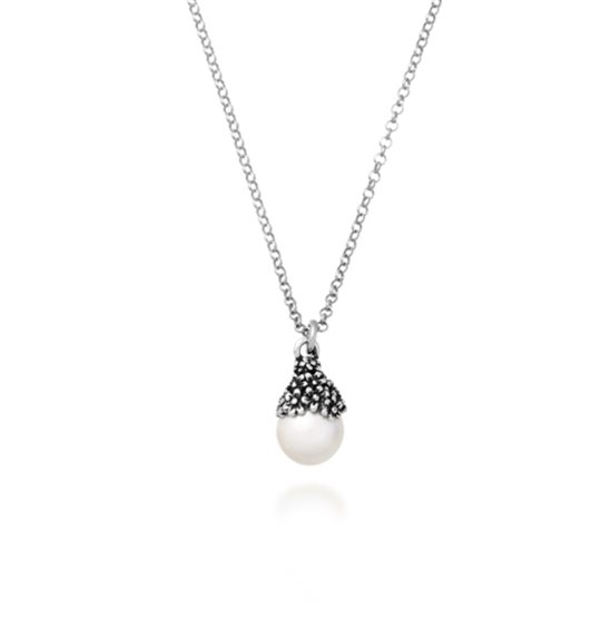 Pendente Drops Margherite. Una grande perla d'acqua dolce incontra l'argento brunito. Eleganti decori in forma di micro-margherite per un gioiello all'insegna della bellezza. Munito di catena, sempre in argento, di 45 centimetri. Realizzato completamente a mano in azienda.