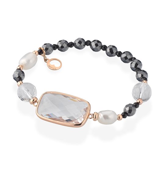 Bracciale in ematite nera, perle d’acqua dolce, cristallo di rocca, spinello nero e Ag925 rosa