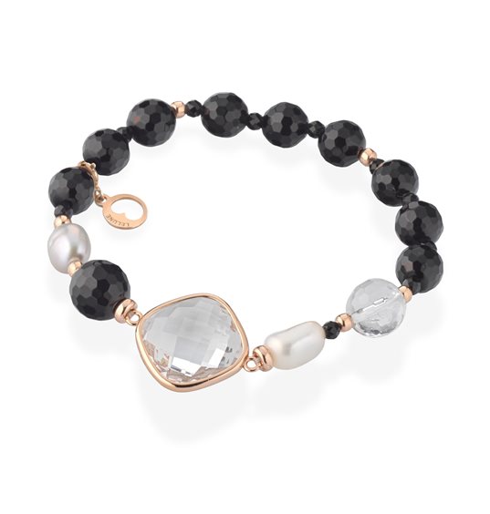 Bracciale con agata nera, perle d’acqua dolce, Ag925 rosa e cristallo di rocca