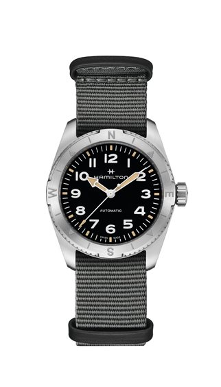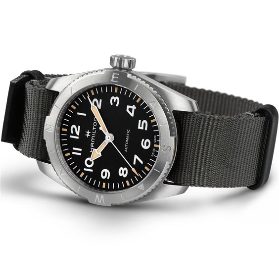Prepararsi per le avventure all’aria aperta non è mai stato così facile grazie al Khaki Field Expedition e al suo nuovo cinturino NATO. Un orologio ideale per tutte le attività outdoor con un design a bussola, che ti permetterà, durante le escursioni, di orientarti con l'aiuto del sole. Racchiuso in una cassa in acciaio da 37 mm corredata da un cinturino NATO in tessuto grigio, il segnatempo è dotato di corona a vite e di un quadrante nero con finitura sabbiata, che lo rendono estremamente resistente.