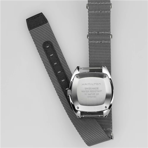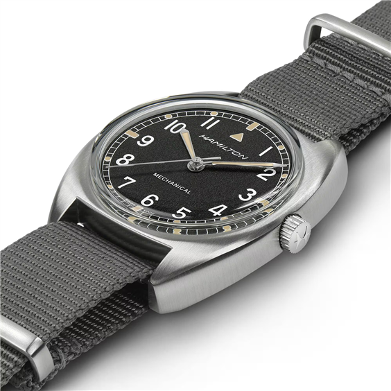 Hamilton Khaki Pilot Pioneer Mechanical H76419931 L' Hamilton Khaki Aviation Pilot Pioneer Mechanical H76419931 è una reinterpretazione dello storico orologio militare realizzato per la Royal Air Force britannica nel 1973. Con il suo design distintivo del quadrante e il robusto cinturino NATO, questo orologio è un orologio militare con vero carattere. All'interno della cassa, il movimento meccanico svizzero Hamilton H-50 (basato sull'ETA 2801-2) a carica manuale ticchetta in modo affidabile. Funziona ad una frequenza di 21.600 semi-frequenze all'ora, dispone di 17 rubini e, soprattutto, di una riserva di carica estesa di 80 ore . L'orologio rimane al polso grazie ad un cinturino in tessuto nato di ottima fattura in grigio con fibbia argentata. Il modello si distingue per l'eccellente leggibilità e la facile chiarezza, necessarie per gli orologi dell'aviazione. Il quadrante grigio è protetto da un vetro minerale . Le lancette e gli indici sono rivestiti con un composto luminescente, che garantisce una luminosità più lunga e una migliore leggibilità anche in condizioni di scarsa illuminazione. Le dimensioni della cassa di 36 x 33 mm rendono l'orologio indossabile sulla maggior parte dei polsi di uomini e donne. L'impermeabilità dell'orologio è di 100 m (10 ATM) , quindi può sopportare un contatto anche maggiore con l'acqua, come il nuoto.