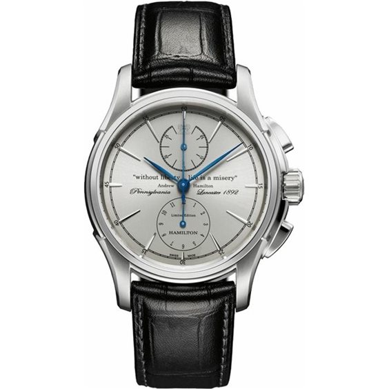 Cronografo a due contatori ispirato allo stile degli orologi old Navy della marina americana. Realizzato in serie limitata a 1892 esemplari ha la cassa in acciaio e il cinturino in pelle nera con fibbia déployante. Sul quadrante grigio è riportata la celebre frase “Without Liberty, Life is a Misery” pronunciata da Lord Hamilton quando nel 1700 difese la libertà di parola. Indici argento applicati e lancette rodiate blu. Datario al 3. Movimento meccanico a carica automatica calibro H21. Impermeabile fino a 5 atmosfere