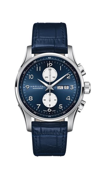 OROLOGIO HAMILTON JAZZMASTER CHROO AUTO - MOVIMENTO: automatico Swiss Made . Cal H-21 - RISERVA DI CARICA: 60 ore - CASSA: in acciaio - QUADRANTE: Blu - FONDELLO: a vite con movimento a vista - DIAMETRO: 45mm - CINTURINO: in pelle blu con fibbia deployante - VETRO: zaffiro - FUNZIONI: cronografo - Day date - IMPERMEABILITA: 10 Atm/100m - GARANZIA UFFICIALE 24 mesi