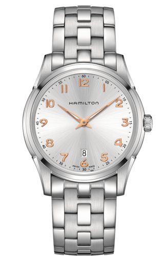 Cassa in acciaio inossidabile con cinturino in acciaio inossidabile. Lunetta fissa in acciaio inossidabile. Quadrante argentato con lancette luminose in oro rosa e indici a ore arabi. Indicatori minuti attorno al bordo esterno. Tipo di quadrante: analogico. Visualizzazione della data a ore 6. Movimento al quarzo. Vetro zaffiro antigraffio. Tirare / spingere la corona. Fondello solido. Diametro cassa: 42 mm. Spessore cassa: 7 mm. Forma della cassa rotonda. Larghezza della fascia: 22 mm. Piegare con la fibbia di rilascio di sicurezza. Resistente all'acqua a 50 metri / 165 piedi. Funzioni: data, ora, minuto, secondo. Stile orologio da sera Etichetta dell'orologio: Swiss Made. Hamilton Jazzmaster Thinline quadrante argentato orologio da uomo in acciaio inossidabile