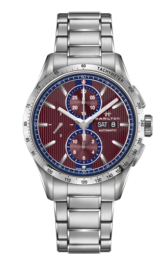 Hamilton, Auto Chrono. Bordeaux e blu, sono questi i colori che contraddistinguono questo orologio. Orologio con movimento automatico di origine svizzera che è possibile ammirare sul retro della cassa. Hamilton modello Day Date Auto.