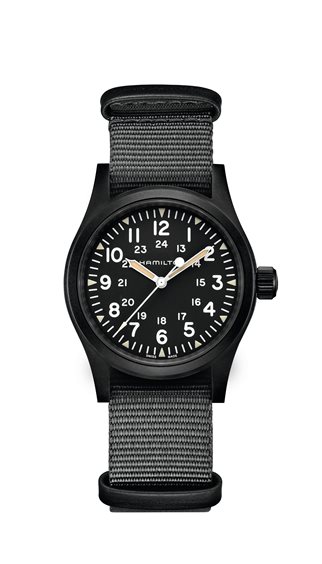 Khaki Field Mechanical La palette nera e grigia di questo Khaki Field Mechanical rappresenta un approccio discreto allo stile militare. Animato dall’esclusivo movimento H-50 a carica manuale, è racchiuso in una cassa da 38 mm. Completano l’insieme gli indici triangolari in Super-LumiNova® di colore radio anticato, e un robusto cinturino NATO. Calibro: H-50; Collezione: Khaki Field; Movimento: Meccanico; Dimensioni della cassa: 38mm; Colore quadrante: Grigio; Materiale della cassa: Acciaio; Rivestimento: PVD nero; Vetro: Zaffiro; Larghezza ansa Larghezza ansa: 20 mm; Riserva di carica: Riserva di carica 80 ore; Impermeabilità: 5 bar (50 m) / 73 psi (164 piedi).