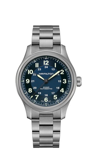 Hamilton Khaki Field Titanium H70545540 L'Hamilton Khaki Field H70545540 è alloggiato in una cassa in titanio da 42 mm leggera, altamente funzionale e di autentica ispirazione militare. È stato trattato con una finitura spazzolata, che completa la natura utilitaristica dell'orologio. È composto da una lunetta fissa e una corona push-pull situata a ore 3, su cui è impresso il logo Hamilton "H". L'orologio è completato da un vetro in cristallo zaffiro che gli fornisce una protezione superlativa contro graffi e rotture. Il quadrante dell'Hamilton Khaki Field H70545540 è presentato in un'elegante tonalità blu. Presenta un design a due fasi e un formato 12/24 ore che rafforza l'autentica atmosfera militaristica dell'orologio. Un microtelefono a siringa si estende dal centro del quadrante, è stato generosamente rivestito con un materiale luminescente che consente di leggere il quadrante al buio. La lancetta dei secondi allungata è dotata di una freccia che percorre senza sforzo il percorso dei 60 secondi che circonda il bordo del quadrante. Il logo Hamilton è presentato in bianco sotto l'indicatore delle 12. Il Khaki Field è presentato con un cinturino in pelle nabuk beige, che si chiude tramite una fibbia ad H in acciaio inossidabile. Il movimento automatico calibro H-10 di Hamilton alimenta questo segnatempo e offre un'incredibile riserva di carica di 80 ore. Ha una precisione di +/- 15 secondi al giorno. È dotato di una lega antimagnetica chiamata Nivachron ed è resistente all'acqua fino a 100 metri, il che significa che può essere indossato durante lo snorkeling.