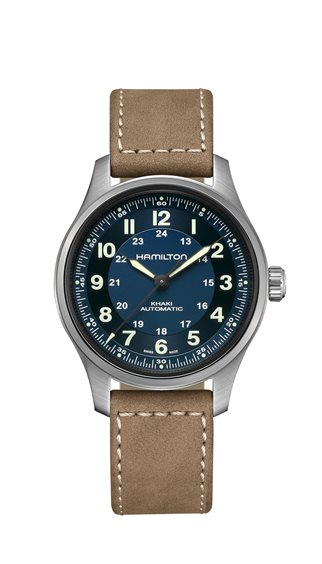 Hamilton Khaki Field Titanium H70545540 L'Hamilton Khaki Field H70545540 è alloggiato in una cassa in titanio da 42 mm leggera, altamente funzionale e di autentica ispirazione militare. È stato trattato con una finitura spazzolata, che completa la natura utilitaristica dell'orologio. È composto da una lunetta fissa e una corona push-pull situata a ore 3, su cui è impresso il logo Hamilton "H". L'orologio è completato da un vetro in cristallo zaffiro che gli fornisce una protezione superlativa contro graffi e rotture. Il quadrante dell'Hamilton Khaki Field H70545540 è presentato in un'elegante tonalità blu. Presenta un design a due fasi e un formato 12/24 ore che rafforza l'autentica atmosfera militaristica dell'orologio. Un microtelefono a siringa si estende dal centro del quadrante, è stato generosamente rivestito con un materiale luminescente che consente di leggere il quadrante al buio. La lancetta dei secondi allungata è dotata di una freccia che percorre senza sforzo il percorso dei 60 secondi che circonda il bordo del quadrante. Il logo Hamilton è presentato in bianco sotto l'indicatore delle 12. Il Khaki Field è presentato con un cinturino in pelle nabuk beige, che si chiude tramite una fibbia ad H in acciaio inossidabile. Il movimento automatico calibro H-10 di Hamilton alimenta questo segnatempo e offre un'incredibile riserva di carica di 80 ore. Ha una precisione di +/- 15 secondi al giorno. È dotato di una lega antimagnetica chiamata Nivachron ed è resistente all'acqua fino a 100 metri, il che significa che può essere indossato durante lo snorkeling.