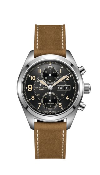 Multifunzionale, di ispirazione militare, nato per l'avventura. Il Khaki Field Auto Chrono 42 mm è tutto questo e molto di più. Robusto, impermeabile fino a 10 bar (100 m) e animato dall'esclusivo calibro automatico H-21 di assoluta precisione, questo orologio è pronto a tutto.