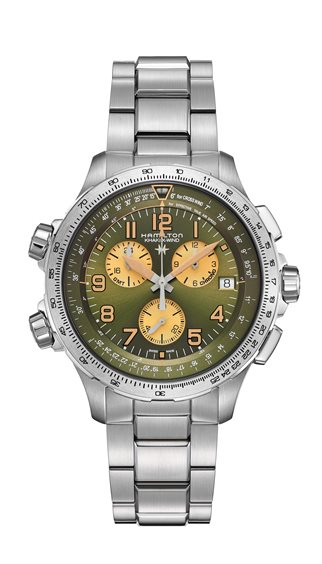 Affronta i cieli più turbolenti con questo Khaki Aviation X-Wind Chrono Quartz GMT dai forti contrasti. Con grandi numerali rivestiti in Super- LumiNova e lancette che ricordano la strumentazione aeronautica di bordo, questo orologio da pilota è pronto per qualsiasi avventura.