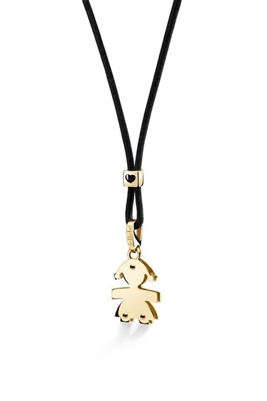 Ciondolo con sagoma femminuccia in oro giallo , altezza 1,40 cm. larghezza 1,20 cm., cordino color nero e distanziatore in oro giallo con cuoricino traforato. Tutti i gioielli della linea le Bebé possono essere personalizzati.