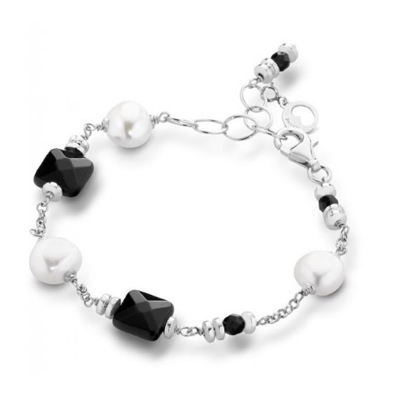 Bracciale elastico in argento 925, perle fresh water, ematite ed onice.