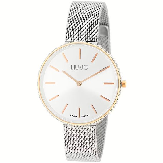 Orologio da donna di Liu Jo della collezione Glamour Globe maxi. Orologio con cassa del diametro di 32 mm, quadrante di colore argento e cinturino in maglia milano in acciaio. Cassa colore oro rosa impreziosita con brillanti. Modello con movimento al quarzo miyota cal. 2025 e resistenza all'acqua di 3 atmosfere.