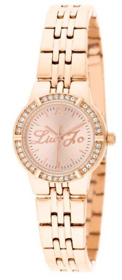 Orologio Liu Jo donna della collezione Cindy. Cassa oro rosa, fondo con chiusura a pressione, ghiera con cristalli bianchi. Quadrante oro rosa con indici in rilievo e logo Liu Jo In Upper Plating.