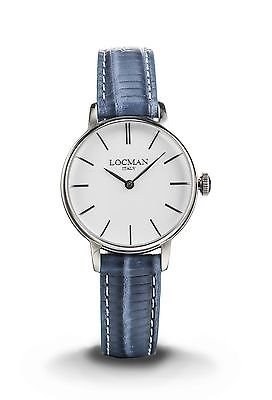 Orologio donna . cassa in acciaio 316L , mm 32 , movimento al quarzo solo tempo , quadrante bianco , fondello in titanio a pressione , numero seriale di produzione inciso nel fondo , cinturino in pelle stampata azzurra. Immagine indicativa , la confezione può variare di forma e colore.