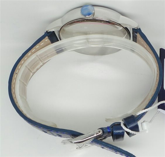 Orologio in acciaio, diametro 41 mm, cinturino in pelle stampata di colore blu con chiusura ardiglione personalizzata, quadrante blu secondi alle ore sei e grand data su doppia finestra, movimento quartz svizzero interamente revisionato dalla scuola italiana orologieria, water resistant 5 atm.Certificato di garanzia