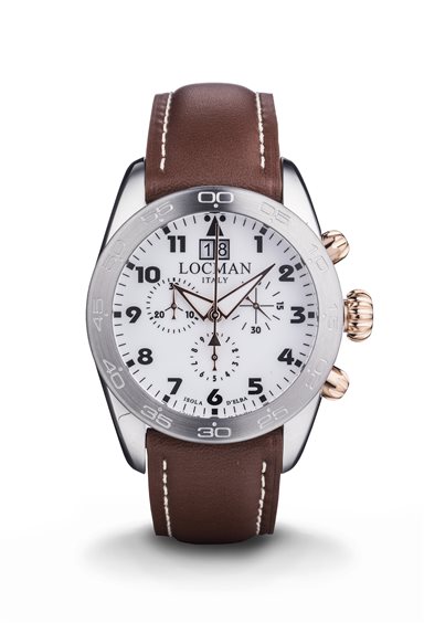 Orologio uomo , cassa in acciaio 316L , movimento cronografo al quarzo , quadrante bianco con numeri arabi neri , datario , corona a vite , fondello in titanio a pressione , numero seriale di produzione inciso sul fondo , ghiera satinata , corona e pulsanti in PVD oro rosè , vetro zaffiro , cinturino in pelle marrone liscio con cuciture bianche.