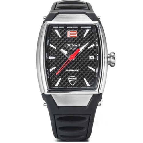 Un’edizione limitata di 1000 referenze numerate, nata dall’accordo con la casa motociclistica di Borgo Panigale. Le due aziende, simbolo di eccellenza italiana, hanno deciso di unire il proprio know-how per realizzare un prodotto in grado di esprimere l’identità di entrambi i marchi. Da un lato l’expertise di DUCATI, leader nel settore motociclistico nel mondo, dall’altro la competenza di LOCMAN nel settore dell’orologeria, pongono le basi perfette per una partnership all’insegna dell’innovazione e del design. Movimento meccanico automatico elaborato S.I.O. (Scuola Italiana di Orologeria). Cassa tonneau in acciaio satinato e dettagli lucidi. Quadrante in fibra di carbonio. Vetro minerale naturale antigraffio, trattamento zaffiro. Cinturino in silicone anallergico traforato. Impermeabile fino a 100 metri. Datario , corona a vite , fondello con viti , numero seriale di produzione inciso al fondo.
