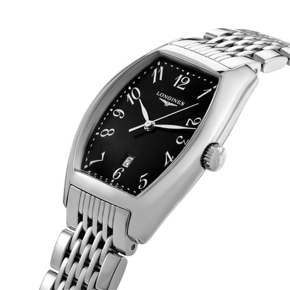 orologio Longines mod.Evidenza Lady L2.155.4.53.6 con cassa in acciaio di forma tonneau 26x30,6 mm., cinturino in acciaio con chiusura déployante, quadrante nero con numeri arabi, calendario al 6.