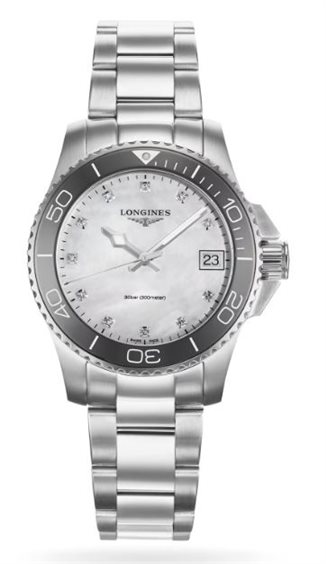 HYDROCONQUEST, L3.370.4.87.6, orologio Al Quarzo, Ø 32.00 mm, Acciaio inossidabile e lunetta in ceramica. Date. Corona a vite Lunetta girevole unidirezionale, Impermeabile fino a 30 bar, Vetro zaffiro antigraffio con trattamento antiriflesso multistrato su entrambi i lati. Quadrante Madreperla bianca, Swiss Super-LumiNova®. Bracciale in Acciaio inossidabile, Con chiusura déployante a doppia sicurezza.