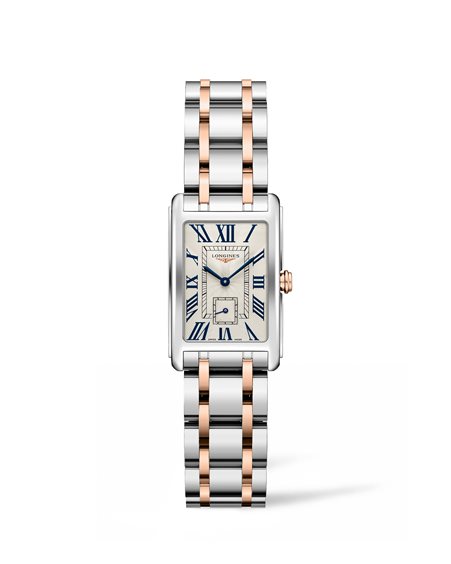 L’intramontabile eleganza della dolce vita all’italiana Fin dalla sua creazione, la collezione Longines DolceVita ha portato in tutto il mondo l'eleganza contemporanea della Maison orologiera Longines. Ispirata alla "Dolce Vita", è un inno alla dolcezza di vivere. Oggi, con un'interpretazione inedita dalle linee addolcite, si apre un nuovo capitolo della storia della collezione. Questi nuovi modelli sedurranno certamente le donne che hanno fatto del fascino uno stile di vita. Cassa in acciaio inossidabile con corona in oro rosa 18 carati; cinturino in acciaio con maglia centrale rivestita in oro rosa 18 carati; fibbia con chiusura déployante a tripla sicurezza e meccanismo di apertura a pressione; quadrante in argento flinqué, numeri romani dipinti e lancette in acciaio azzurrato.