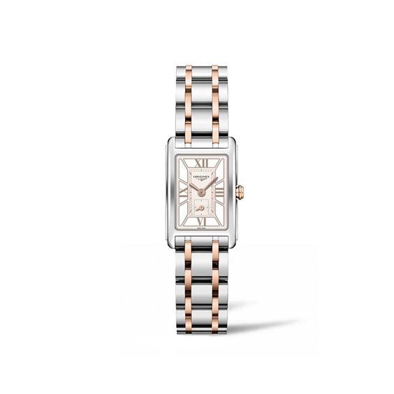 LONGINES DOLCEVITA, L5.255.5.75.7, orologio Al Quarzo, 20.80 X 32.00 mm, Acciaio inossidabile con corona in oro rosa 18 carati. Impermeabile fino a 3 bar, Vetro zaffiro antigraffio. Quadrante Bianco. Bracciale in Acciaio con maglia centrale rivestita in oro rosa 18 carati, 200 micron, Con chiusura déployante a tripla sicurezza e meccanismo di apertura a pressione.