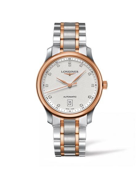 LONGINES MASTER COLLECTION, L2.628.5.97.7, orologio Automatico, Ø 38.50 mm, Acciaio con maglia centrale rivestita in oro rosa 18 carati, 200 micron. Date, Movimento meccanico a carica automatica con frequenza di 25'200 alternanze orarie e riserva di carica di circa 72 ore. Impermeabile fino a 3 bar, Vetro zaffiro antigraffio. Quadrante Argento grains d'orge. Bracciale in Acciaio con maglia centrale rivestita in oro rosa 18 carati, 200 micron, Con chiusura déployante a tripla sicurezza e meccanismo di apertura a pressione. Referenza L2.628.5.97.7