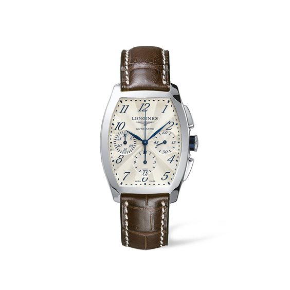 Orologio Longines da uomo collezione Evidenza 40mm. Cassa rettangolare Tonneau in acciaio inossidabile misura 34,90mm x 40mm. Movimento meccanico a carica automatica con frequenza di 28.800 alternanze orarie e riserva di carica di 42 ore. Quadrante di colore argento flinquè, numeri arabi dipinti e lancette in acciaio azzurro. Vetro zaffiro antigraffio bombato con trattamento antiriflesso multistrato sul lato interno. Cinturino in pelle di alligatore marrone con chiusura dèployante a tripla sicurezza e meccanismo di apertura a pressione. Impermeabile fino a 3bar(30m). Garanzia Longines valida 2 anni. Referenza L2.643.4.73.4