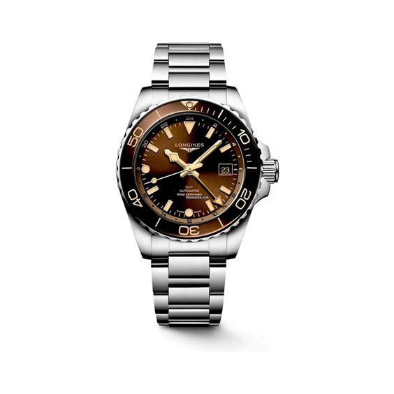 HYDROCONQUEST GMT La collezione HYDROCONQUEST è un vero e proprio punto di riferimento nell'ambito degli orologi sportivi. I nuovi modelli sono animati dall'esclusivo movimento GMT di Longines, che permette di visualizzare l'ora di due fusi orari. Il movimento è dotato di un bilanciere-spirale in silicio e innovativi componenti amagnetici che rendono questo calibro 10 volte più resistente ai campi magnetici rispetto allo standard ISO 764. L'HydroConquest GMT si distingue anche per la cassa in acciaio inossidabile da 41 mm con fondello e corona avvitati. Questo modello presenta una nuova lunetta unidirezionale scanalata in ceramica marrone con capsula luminescente. Il quadrante è marrone. Questa versione è disponibile con bracciale in acciaio inossidabile o cinturino NATO beige in materiale riciclato.