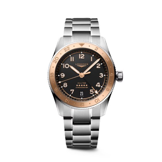 LONGINES SPIRIT ZULU TIME 1925, L3.803.5.53.6, orologio Automatico, Ø 39.00 mm, Acciaio inossidabile e lunetta girevole bidirezionale con inserto spazzolato circolare sovrastato da una coiffe in oro rosa 18 carati 5N. GMT Date, Movimento meccanico a carica automatica con frequenza di 25'200 alternanze orarie e riserva di carica di circa 72 ore, bilanciere-spirale in silicio monocristallino. Lunetta girevole bidirezionale Corona a vite, Impermeabile fino a 10 bar, Vetro zaffiro antigraffio con trattamento antiriflesso multistrato su entrambi i lati. Quadrante Nero mat, Swiss Super-LumiNova®. Bracciale in Acciaio inossidabile, Con chiusura déployante a doppia sicurezza e meccanismo di apertura a pressione. Il LONGINES Spirit Zulu Time simboleggia la maestria centenaria del marchio negli orologi con più fusi orari. Le sue origini e il suo nome derivano dal primo orologio da polso LONGINES con due fusi orari, realizzato nel 1925, che presentava la bandiera Zulu sul quadrante (dove Zulu si riferisce alla lettera “Z” che indica il tempo universale per gli aviatori). Esteticamente, il LONGINES Spirit Zulu Time si distingue per l’esecuzione meticolosa e la particolare cura dei dettagli. Presenta una lunetta girevole bidirezionale con inserto in ceramica. Ogni modello è alimentato da un esclusivo calibro LONGINES, dotato di un bilanciere-spirale in silicio, resistente ai campi magnetici e certificato come cronometro COSC.