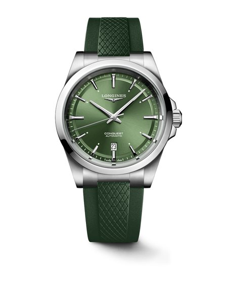 orologio Automatico, Ø 41.00 mm, Acciaio inossidabile. Data, Movimento meccanico a carica automatica con frequenza di 25'200 alternanze orarie e riserva di carica di circa 72 ore, bilanciere-spirale in silicio monocristallino. Corona a vite, Impermeabile fino a 10 bar, Vetro zaffiro antigraffio con trattamento antiriflesso multistrato su entrambi i lati. Quadrante verde a raggi di sole, Swiss Super-LumiNova®. Bracciale in Cinturino in caucciù, Con doppia chiusura deployante di sicurezza con sistema di microregolazione. Il Conquest, l’orologio del quotidiano per eccellenza, è stato anche la prima collezione LONGINES ad avere il proprio nome protetto dall’Ufficio Federale Svizzero per la Proprietà Intellettuale nel 1954. Da allora, la collezione si è evoluta grazie al design e alla tecnologia, pur rimanendo fedele alla sua identità originaria, esprimendo un incontro armonioso di audacia, design contemporaneo ed eleganza sportiva. Ogni orologio Conquest mette in mostra l’impegno costante di LONGINES per le prestazioni e l’eccellenza orologiera. Con i suoi modelli versatili, la linea Conquest testimonia la dedizione di LONGINES nel creare orologi per ogni sfaccettatura della vita. La collezione è disponibile in una vasta gamma di dimensioni, materiali e colori.