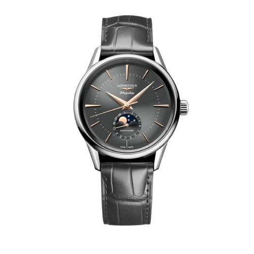 FLAGSHIP HERITAGE MOONPHASE, L4.815.4.52.2, orologio Automatico, Ø 38.50 mm, Acciaio inossidabile. Riserva di carica Date, Movimento meccanico a carica automatica con frequenza di 25'200 alternanze orarie e riserva di carica di circa 72 ore, bilanciere-spirale in silicio monocristallino. Medaglione in oro 18 carati con caravella, Impermeabile fino a 3 bar, Vetro zaffiro antigraffio con trattamento antiriflesso multistrato su entrambi i lati. Quadrante Sunray anthracite, Swiss Super-LumiNova®. Bracciale in Cinturino in alligatore, Con fibbia.