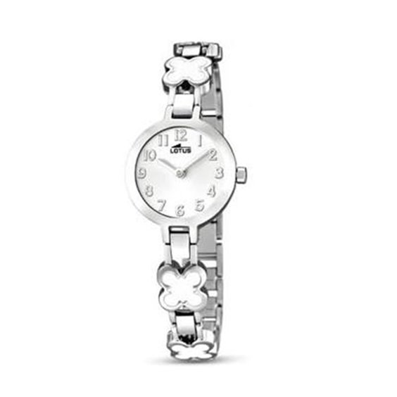 Orologio da bambina con cassa e cinturino in acciaio anallergico; il cinturino è personalizzato con 4 disegni di fantasia in smalto bianco. Il quadrante è di colore argento con numeri arabi per facilitare la lettura dell'orologio. Water resistant 5 atm Cinturino regolabile , movimento al quarzo , vetro minerale , fondello a pressione. Immagine indicativo , la confezione può variare di forma e colore.