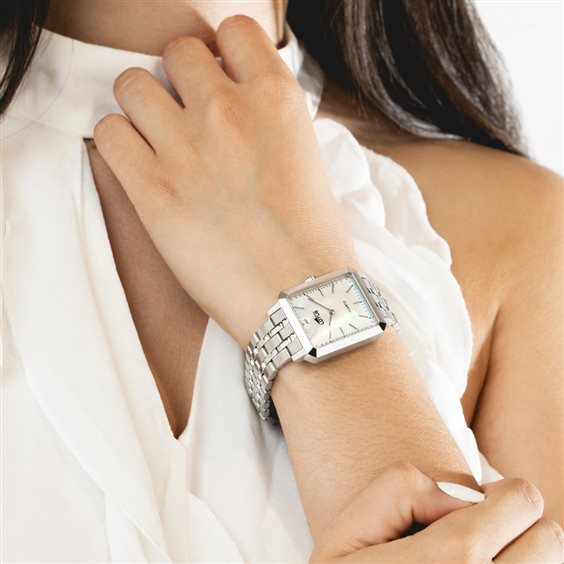 Con cassa rettangolare, questo orologio della Square Series unisce la morbidezza del quadrante in madreperla alla solidità del bracciale in acciaio inox. Un design femminile che riflette eleganza senza tempo e modernità. Cassa dimensioni 28 x 32 mm