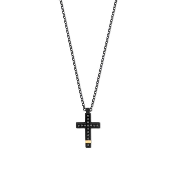 Accanto al titanio, in questa croce si trova come elemento di preziosita', un riporto in oro rosso 18 kt. I diamanti black da un punto rivestono l'intera superficie del ciondolo, lasciando in evidenza l'inserto in oro rosso 18 kt. La catena passante è arricchita da due anellini e una chiususra con moschettone in oro rosso 9 kt . A garanzia del marchio MANO|J., troviamo il diamante black da un punto incastonato sulla targhetta con il nome del brand.