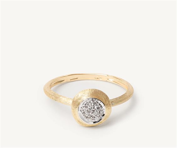 Anello con Moneta di Diamanti, Jaipur. Questo elegante anello monta una moneta di Pavé di Diamanti taglio brillante. L’oro giallo 18kt è inciso a mano con l’antica tecnica del Bulino Millerighe.