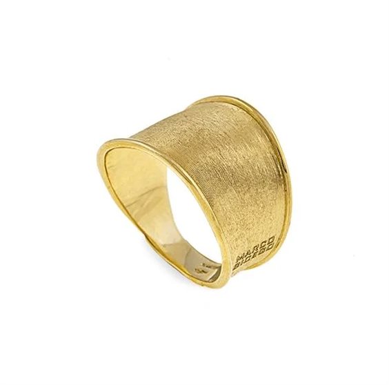 Questo anello a fascia, dai profili irregolari e dal design lineare, in oro giallo 18kt, inciso a mano con l’antica tecnica del Bulino Millerighe, vanta una vestibilità unica e volumi essenziali.