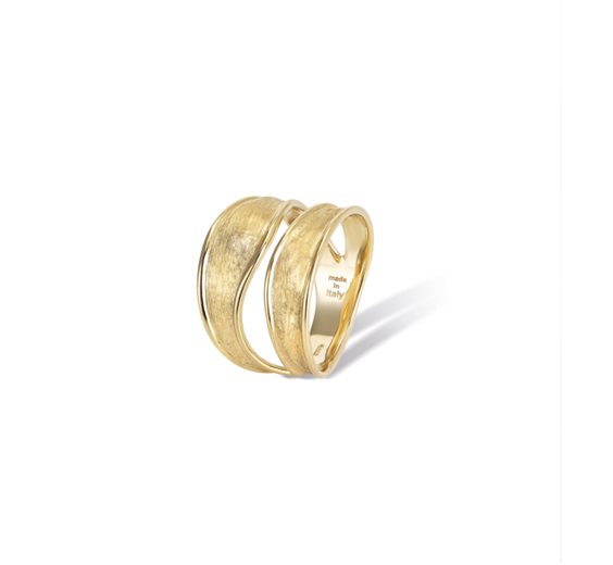 Questo anello è caratterizzato da profili irregolari e dal design lineare. Due fasce in oro giallo 18kt avvolgono le dita con la loro vestibilità unica. La superficie è incisa a mano con l'antica tecnica del Bulino Millerighe. misura dito: 15.